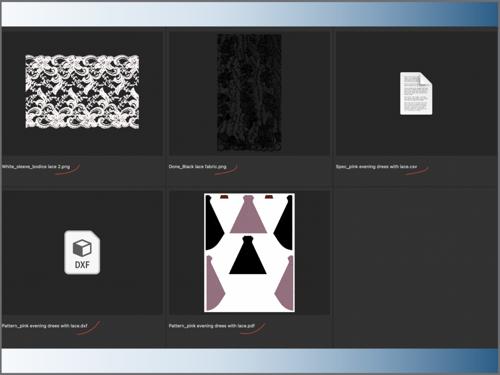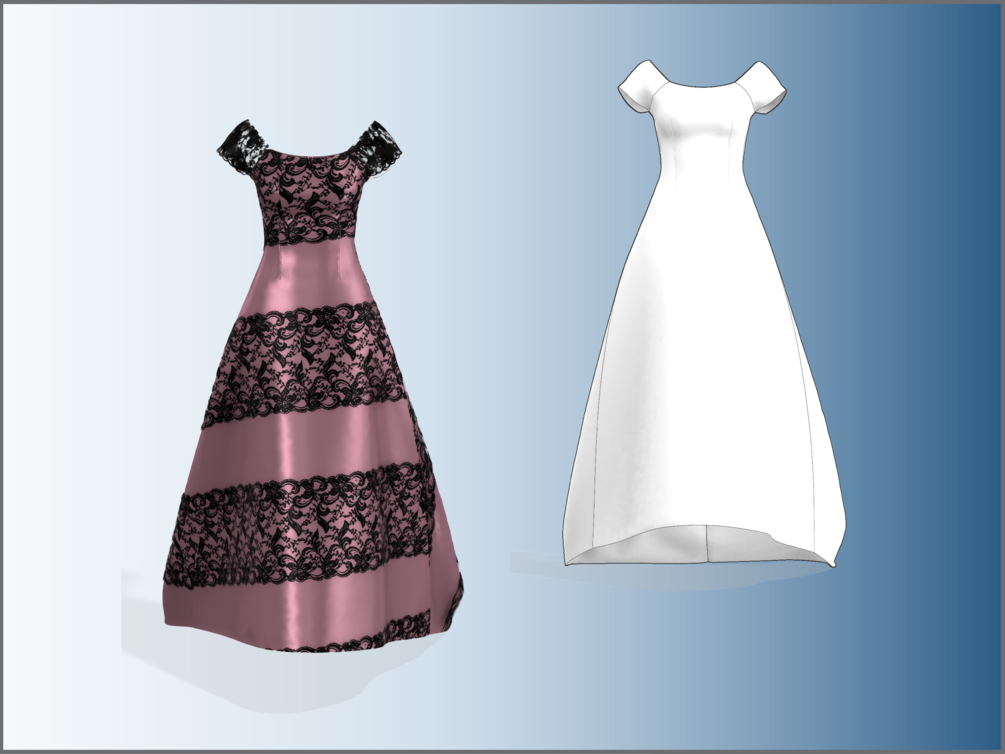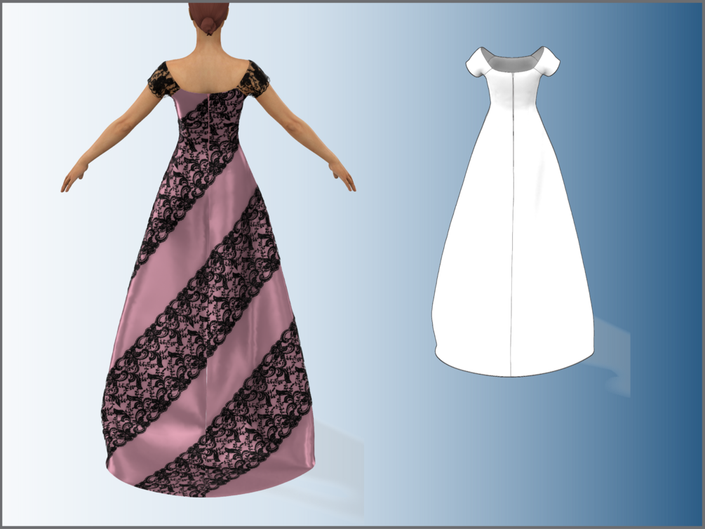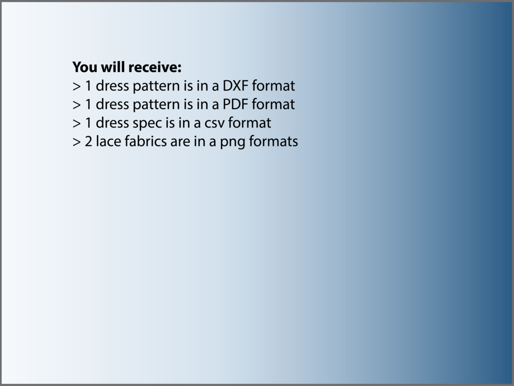 You'll get: 2 patterns (1 dxf, 1 adobe pdf), 2 lace fabrics (png), 1 dress spec.