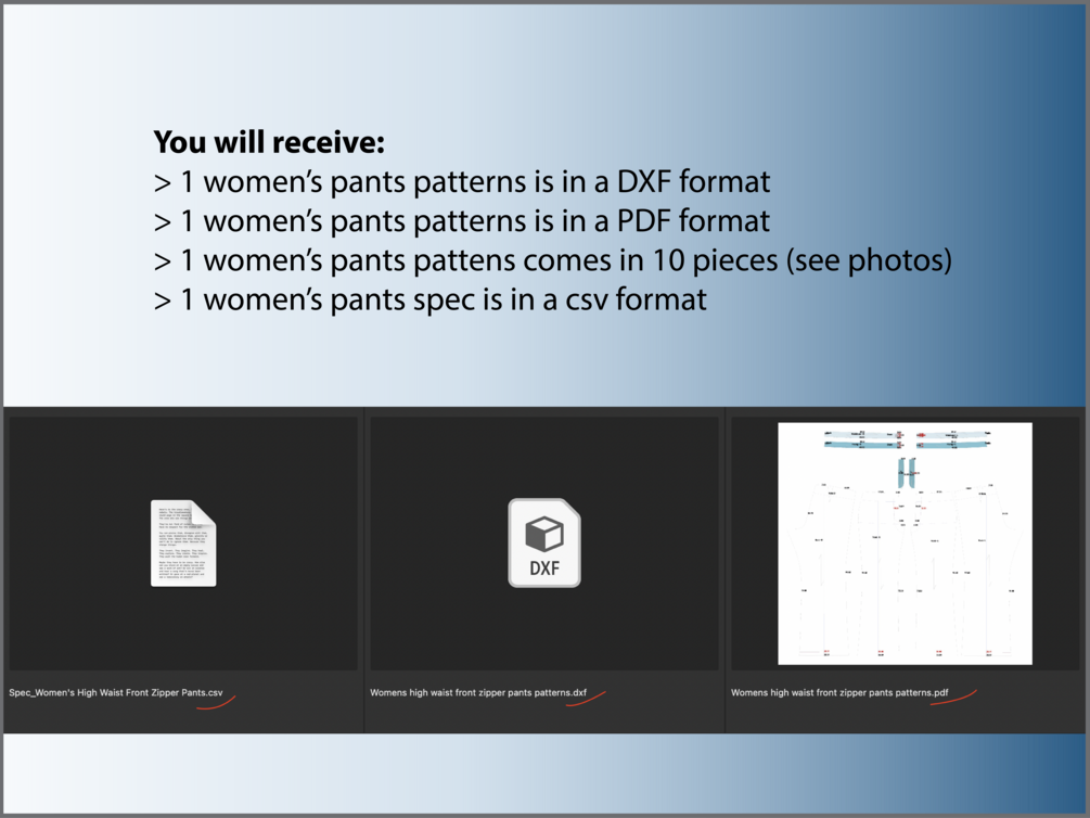 You will get: 1 pants patterns dxf, 1 pants patterns pdf, 1 pants spec.