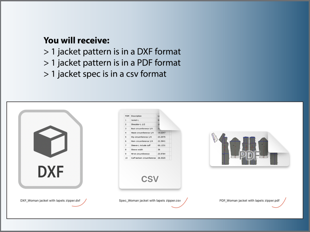 You'll get: 2 patterns (1 dxf, 1 adobe pdf), 1 jacket spec.
